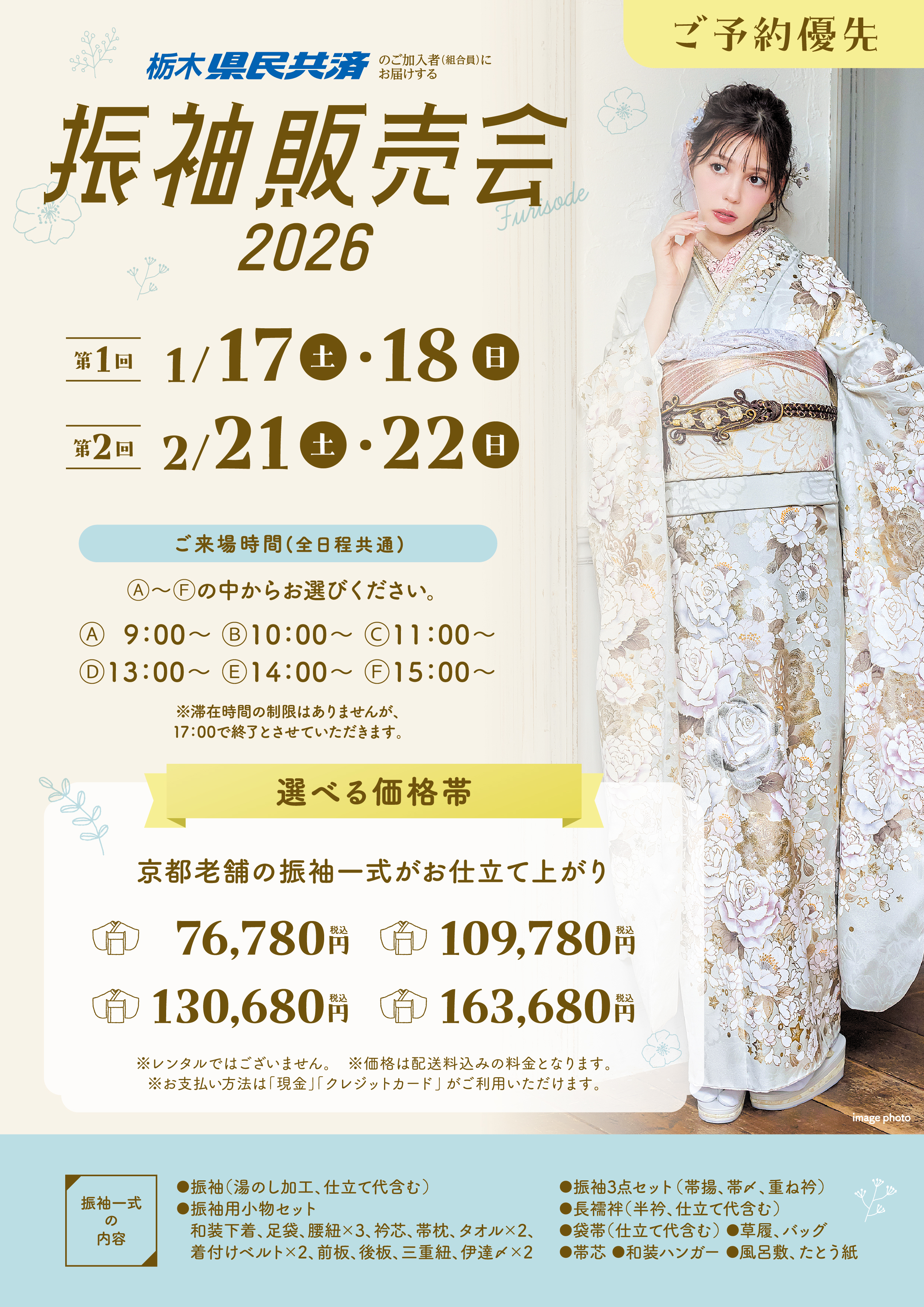 ※草履・バッグ・オプション品(ショール・髪飾り等)につきましては、当日お持ち帰りいただく商品となりますので、ご了承ください。 - ご本人サイズでのお仕立て品ですので、お申し込み後の変更およびキャンセルはご遠慮ください。